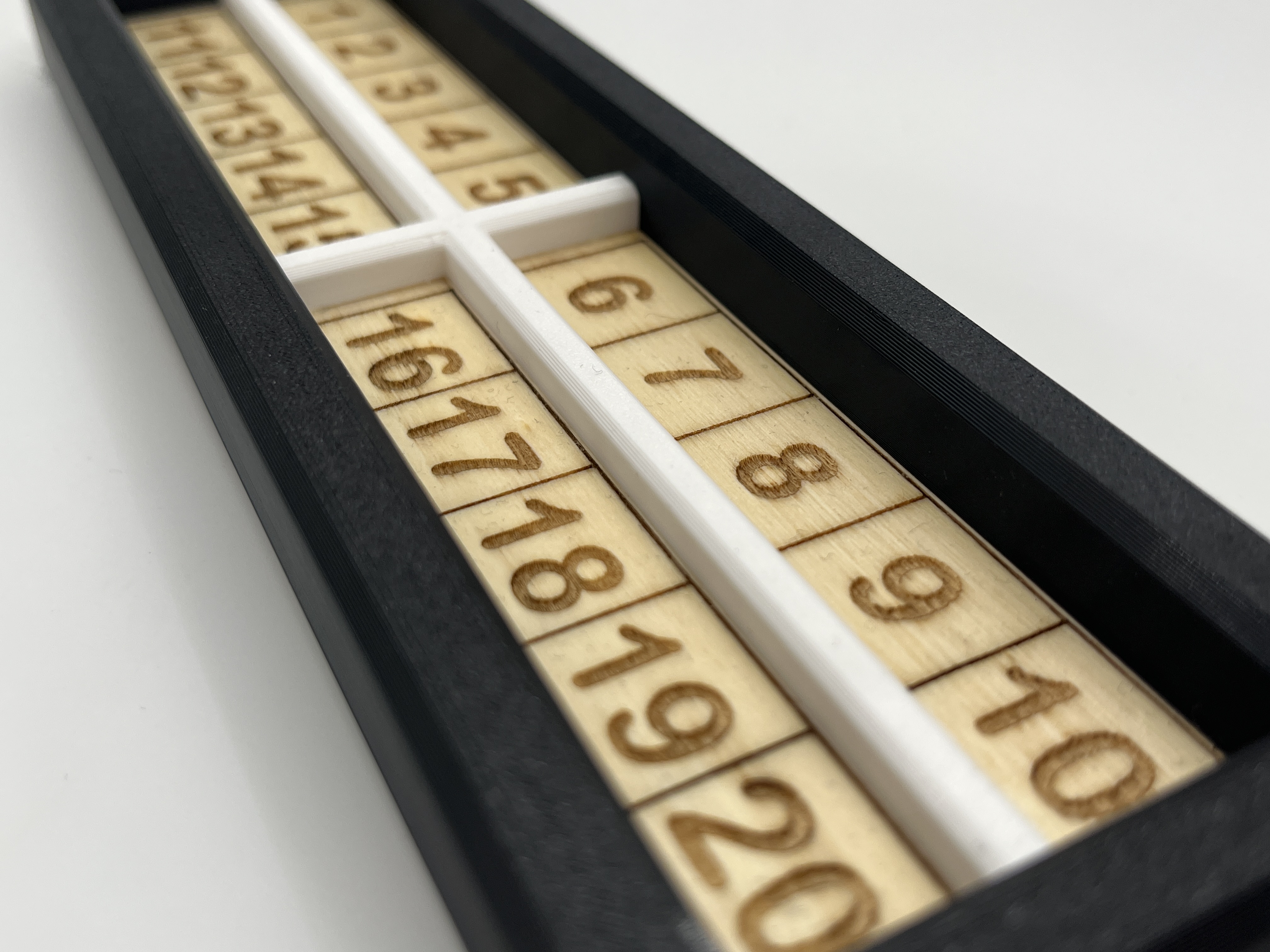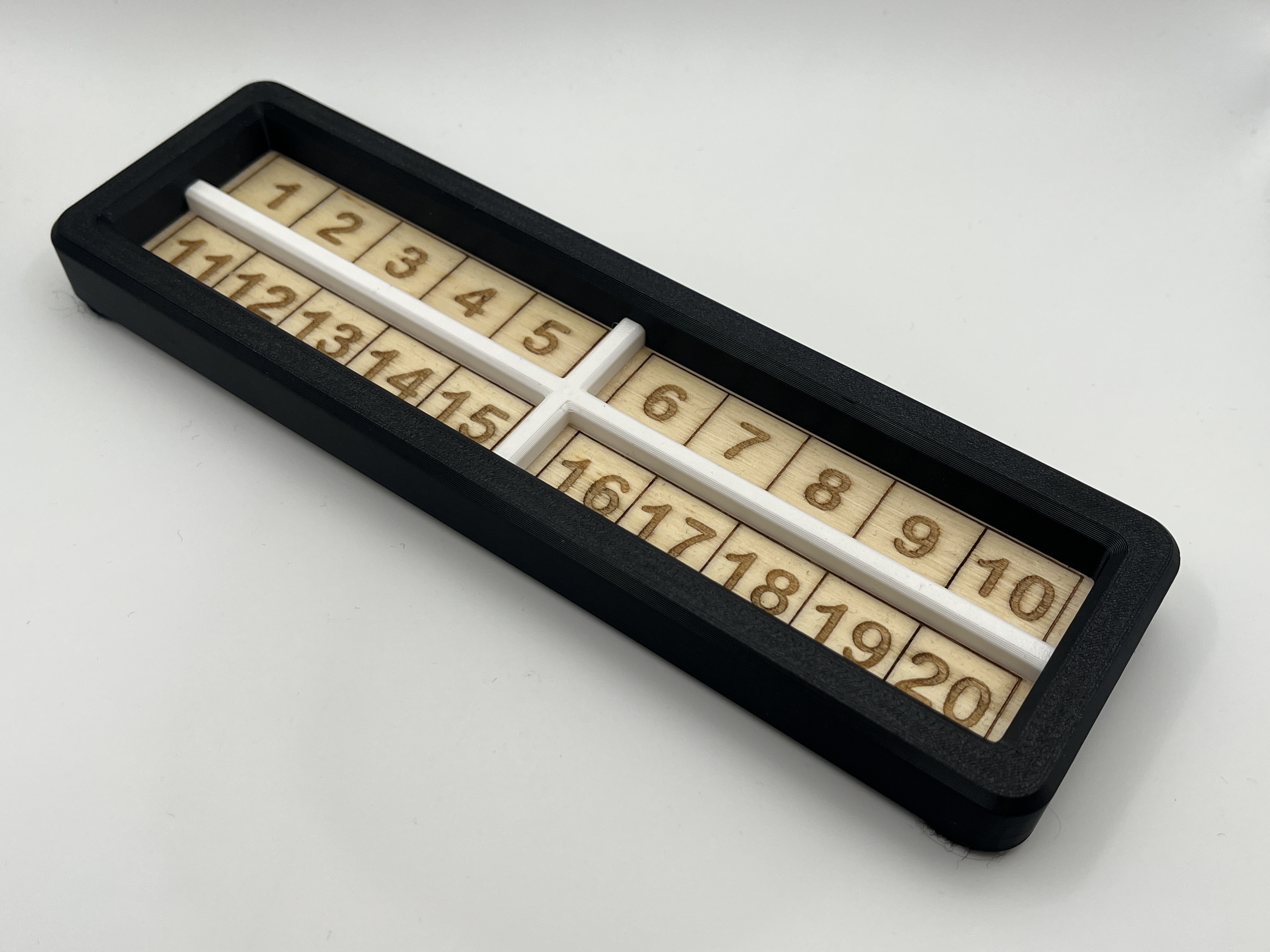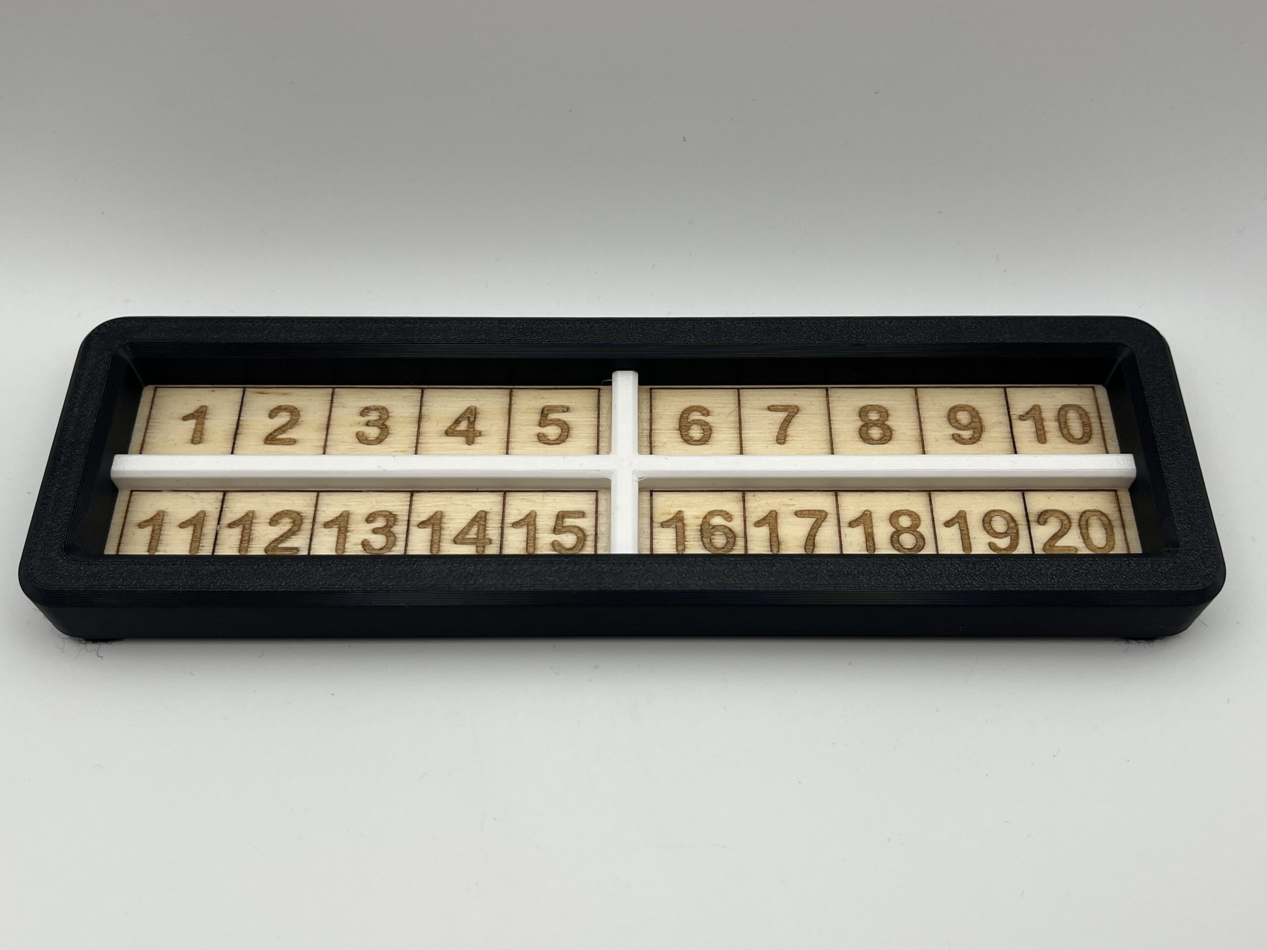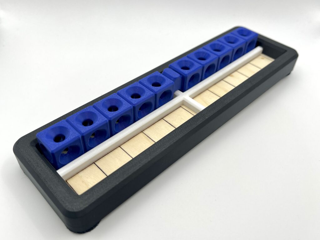 Der Rahmen wurde im 3D-Druck hergestellt und enthält eine mittige Abgrenzung, sodass je 5 Würfel pro Abgrenzung eingelegt werden können.