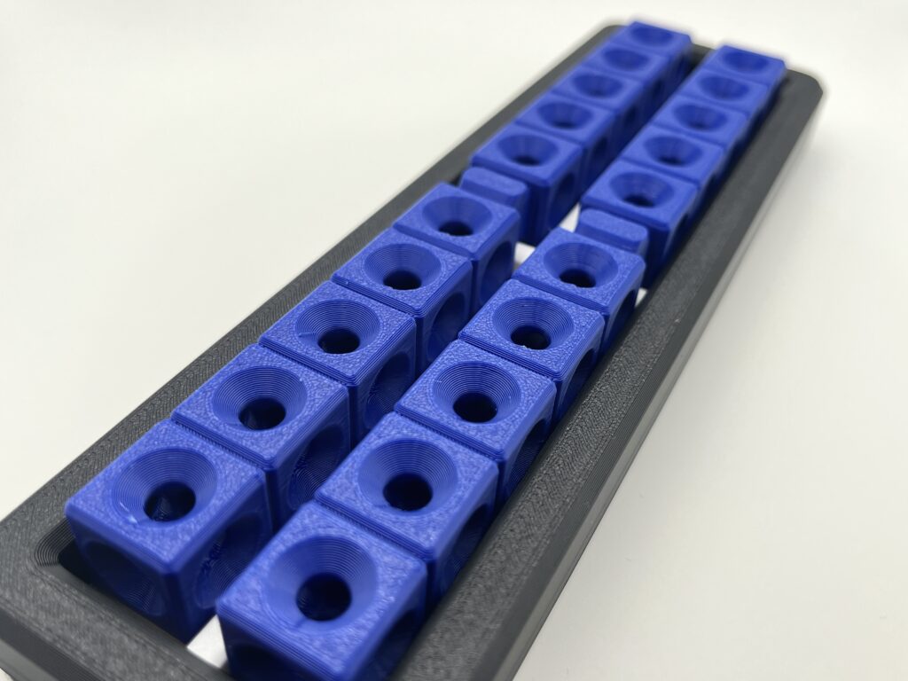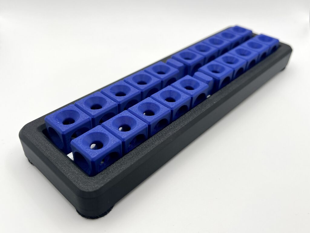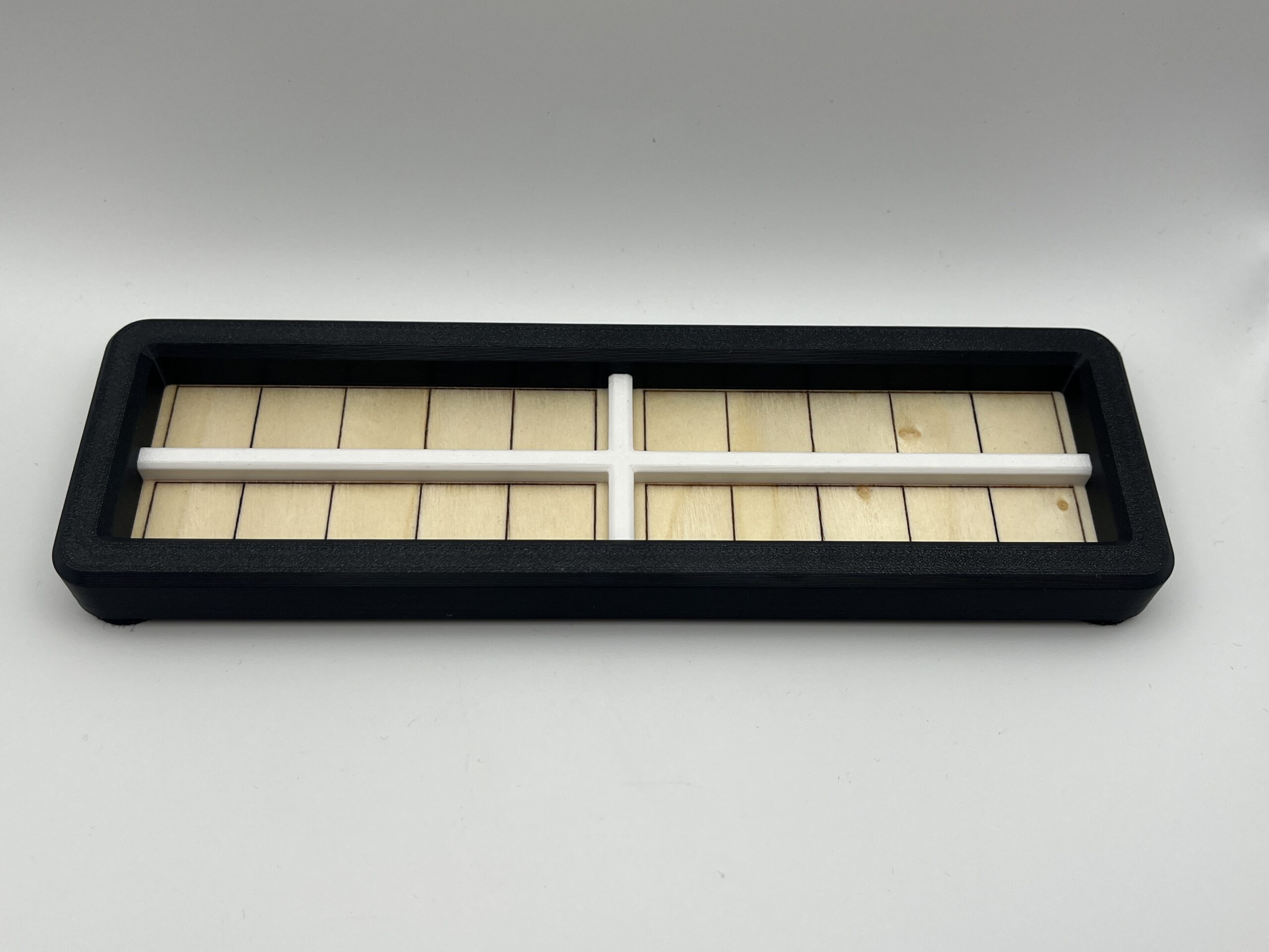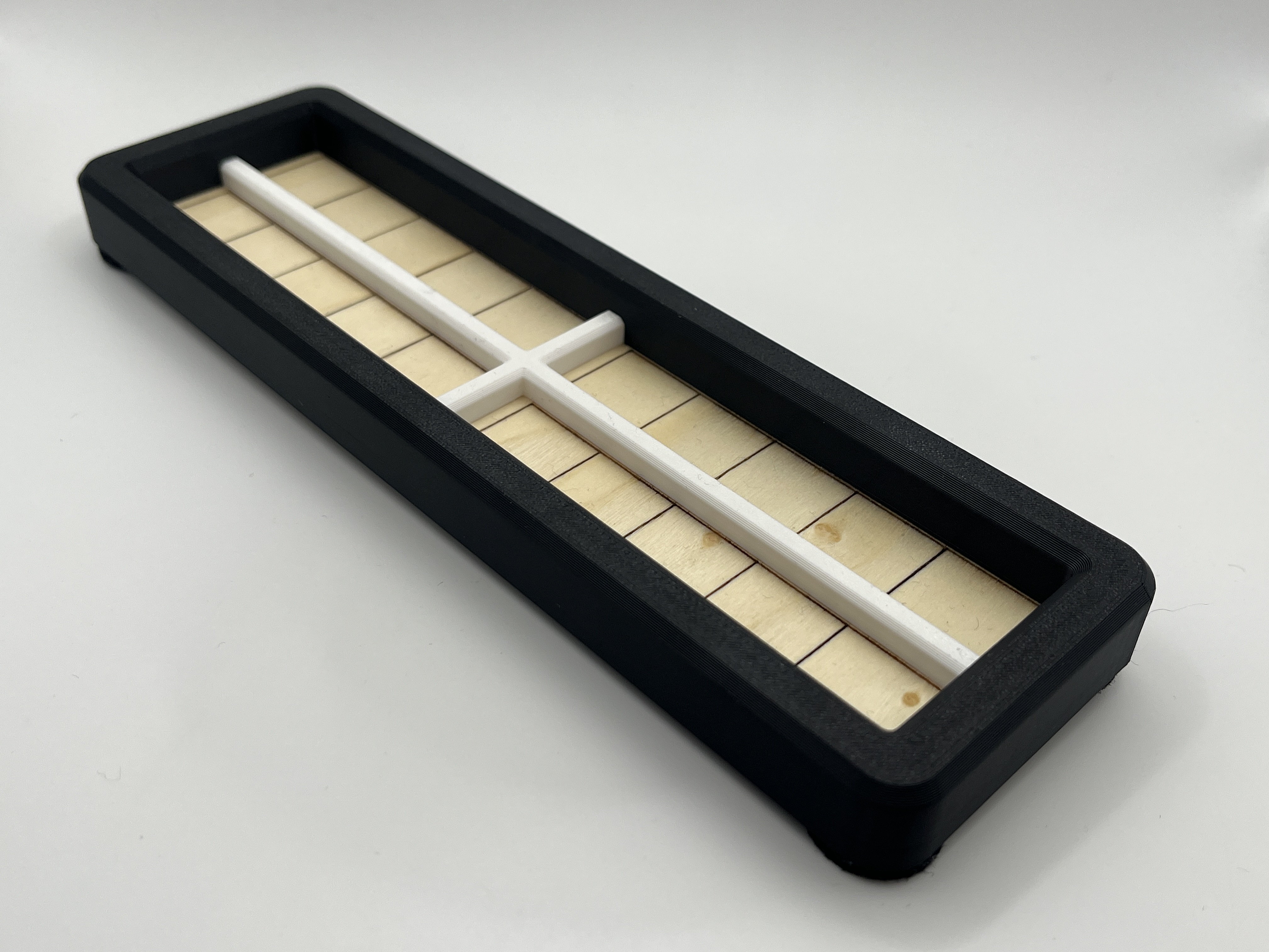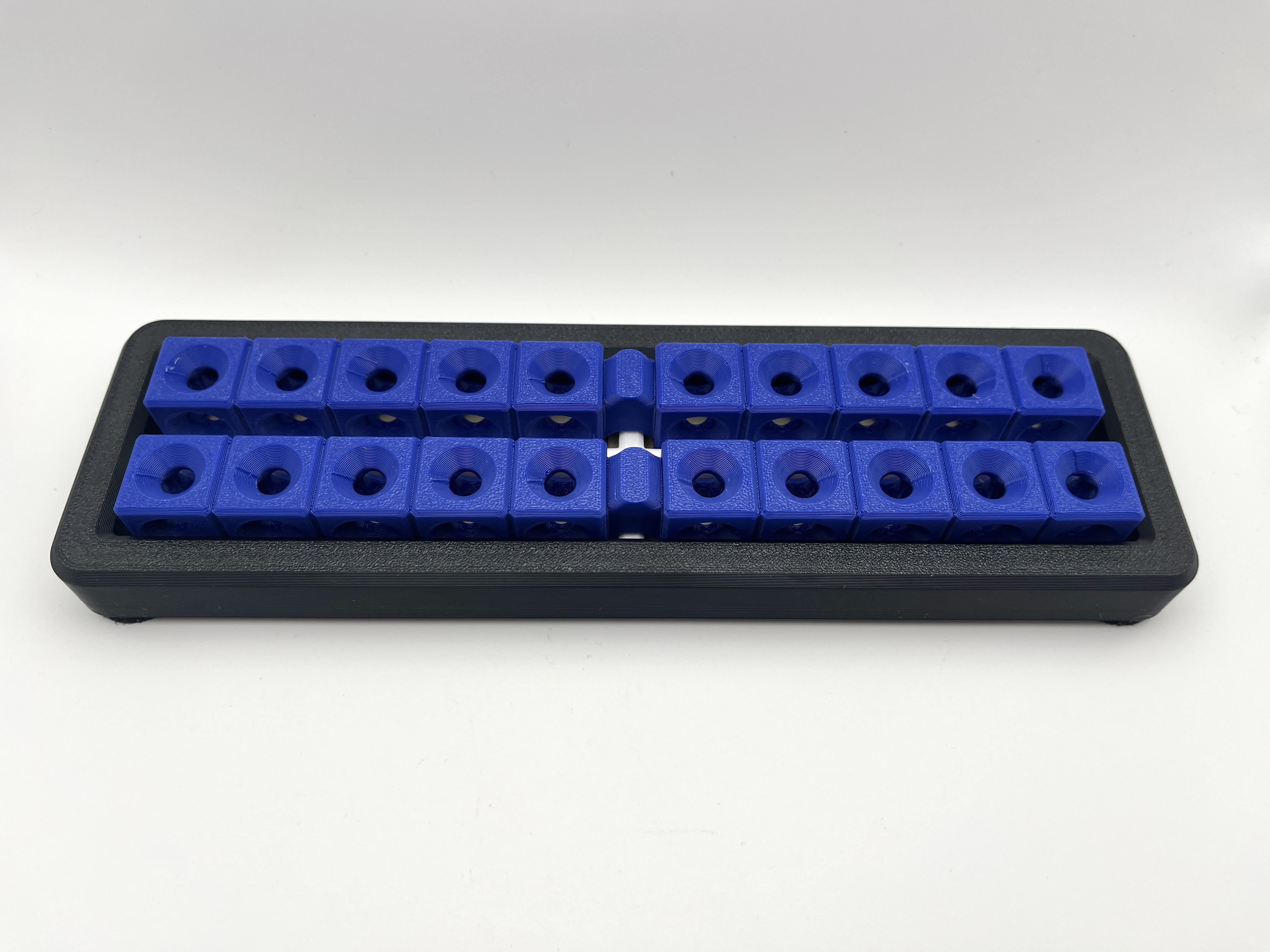 Der Rahmen wurde im 3D-Druck hergestellt und enthält eine mittige Abgrenzung, sodass je 5 Würfel pro Abgrenzung eingelegt werden können.
