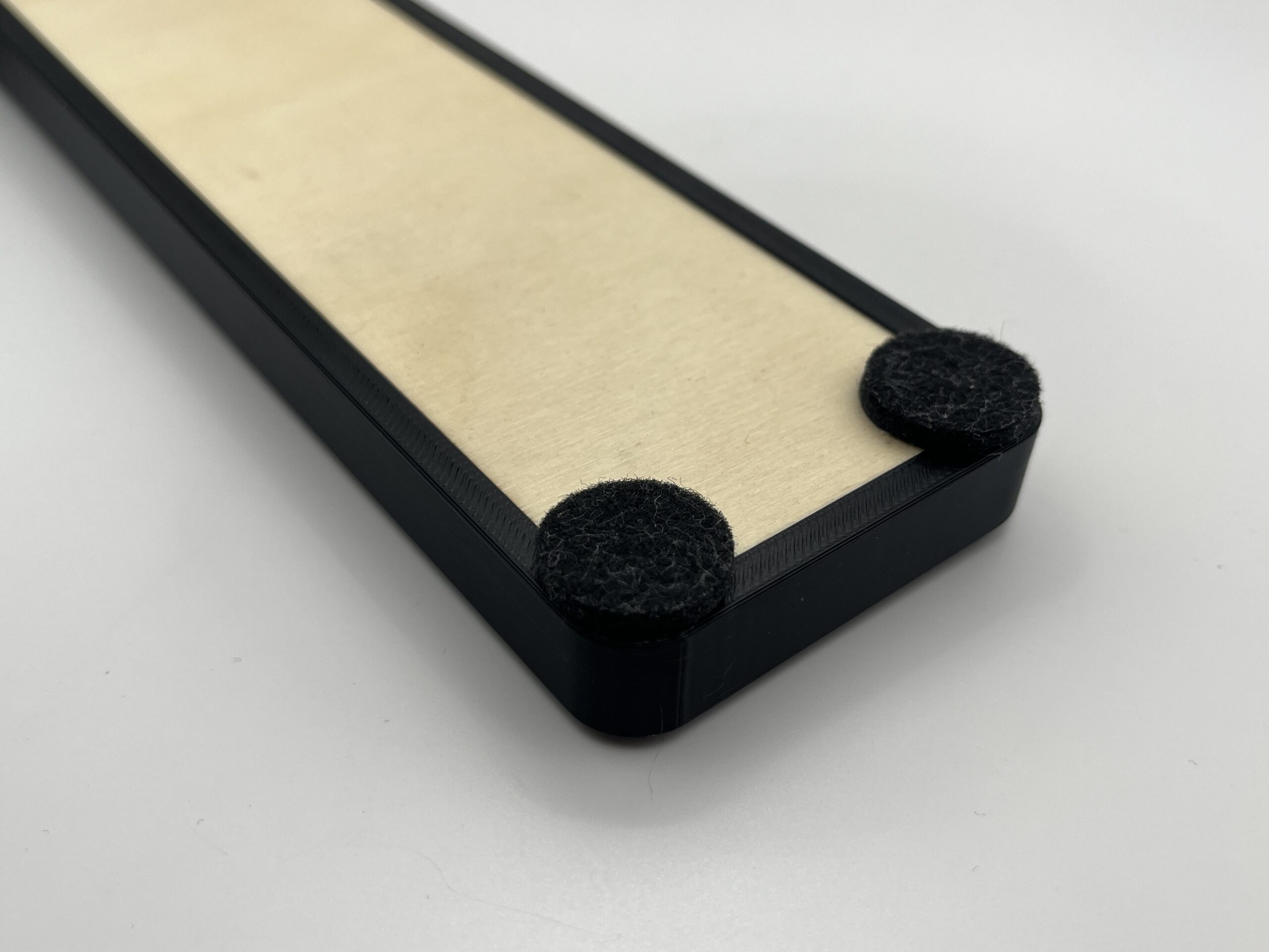 Der Boden besteht aus lasergeschnittenem Holz, die Zahlen und Trennlinien wurden eingraviert, und Filzfüße auf der Unterseite sorgen dafür, dass das Brett rutschfest und angenehm leise auf dem Tisch liegt.