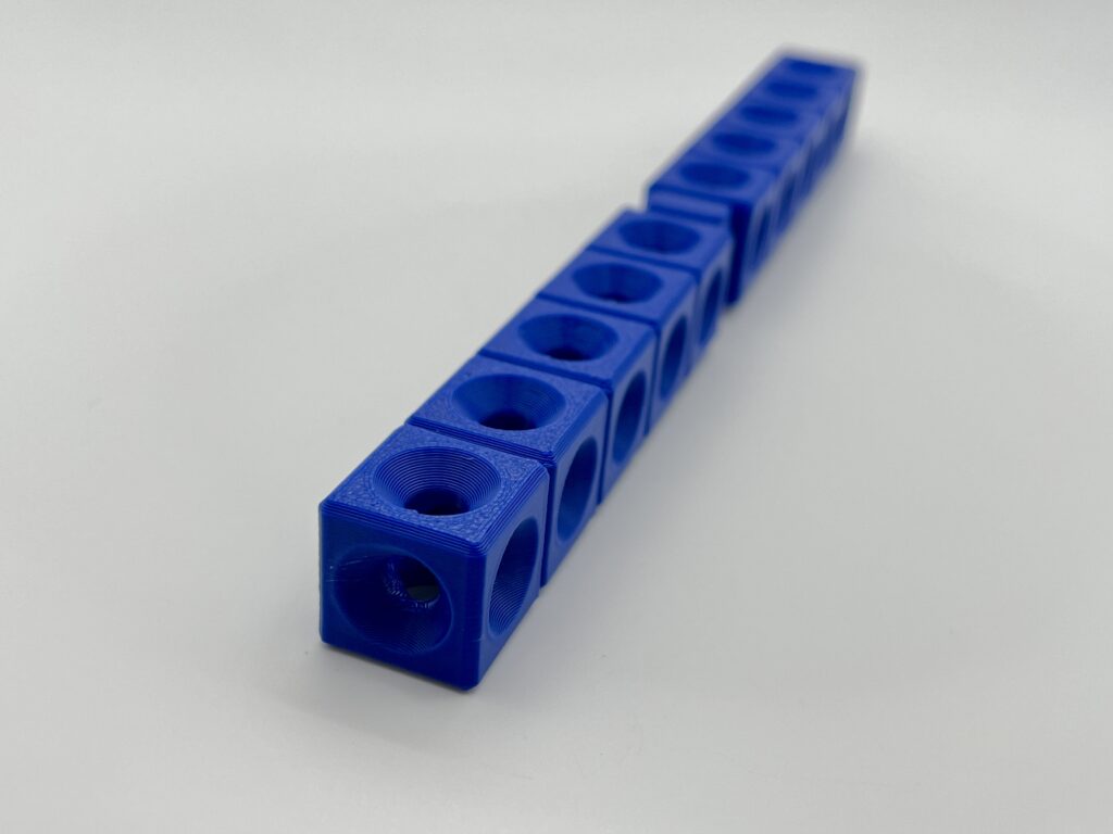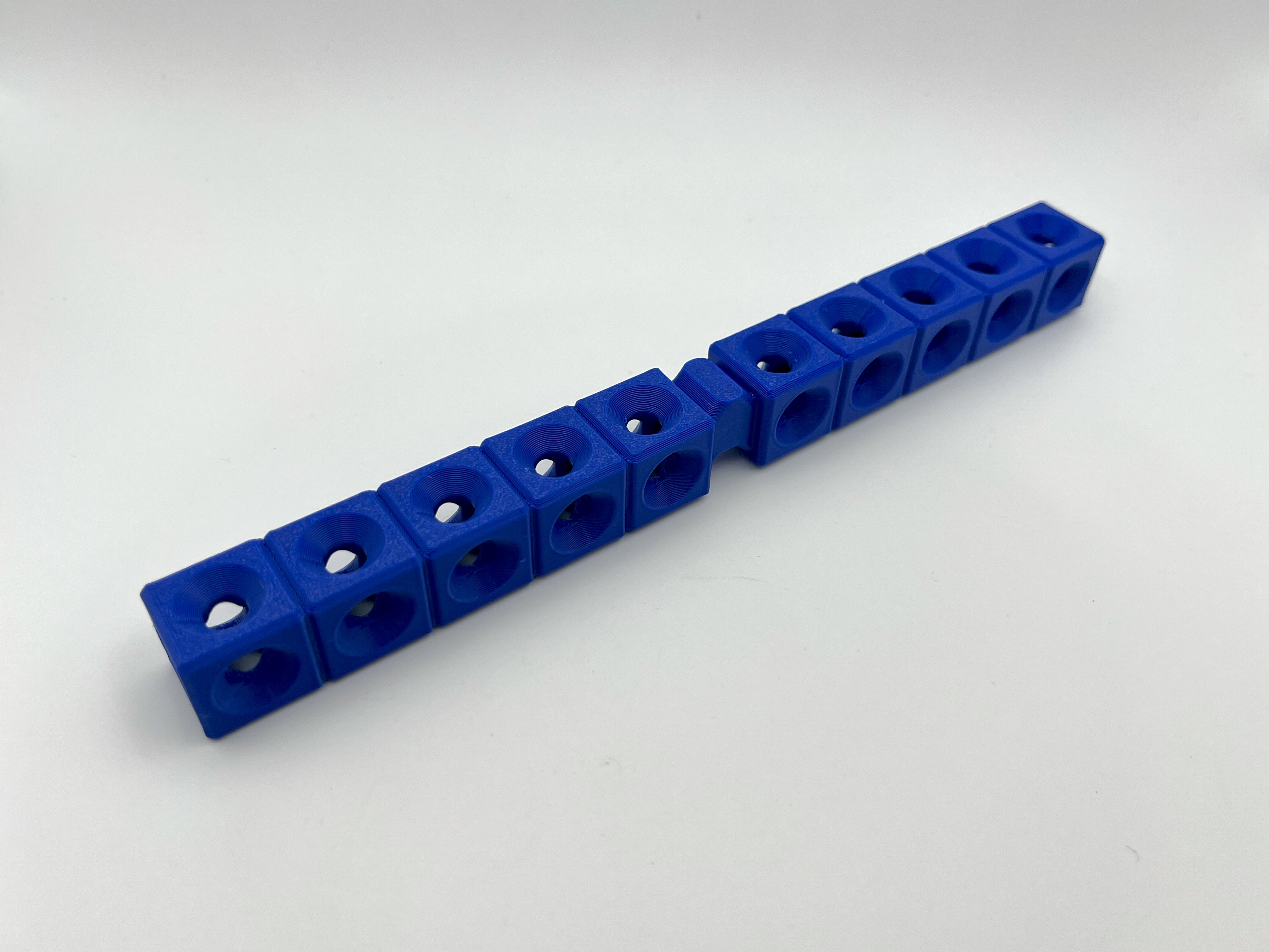 Passend dazu haben wir Zehnerstangen angefertigt, damit nicht jedes Mal zehn einzelne Würfel zusammengesteckt werden müssen.